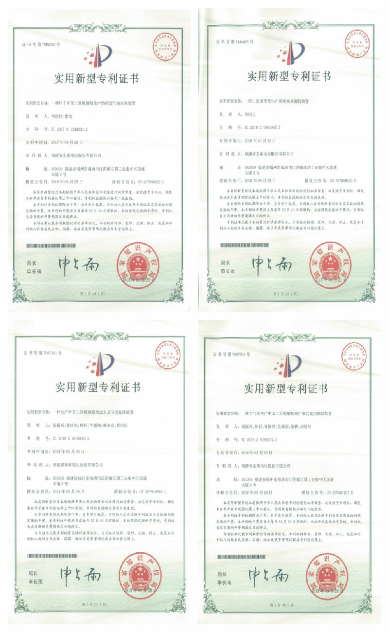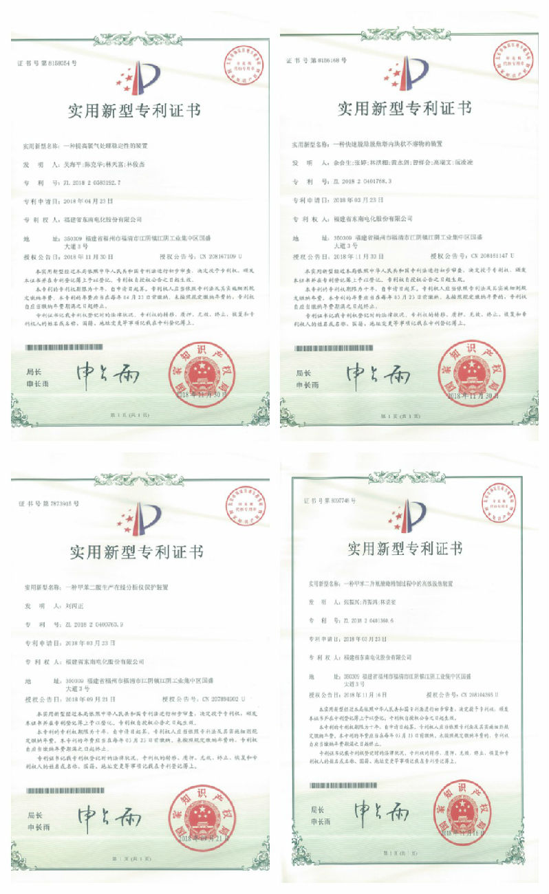 年终至,喜报传!东南电化公司《一种用于甲苯二异氰酸酯生产的硝烟气液分离装置》、《一种甲苯二胺生产在线分析仪保护装置》、《一种提高氯气处理稳定性的装置》、《一种快速脱除焦塔内块状不溶物的装置》、《一种生产甲苯二异氰酸酯的废水及污泥处理装置》等8项技术成果获得了国家知识产权专利局颁发的实用新型专利证书。